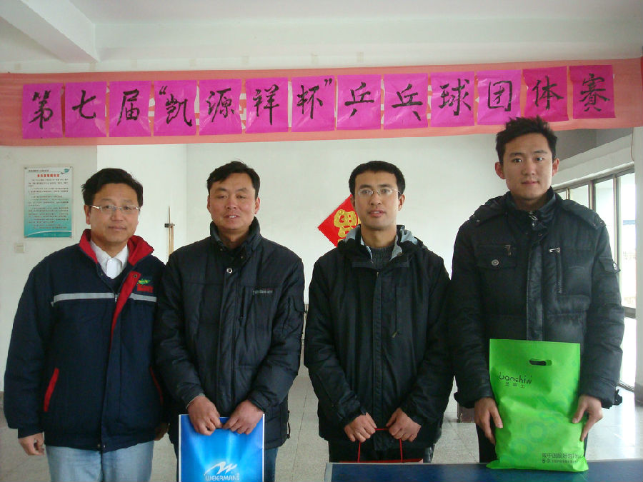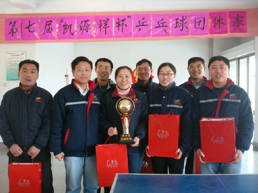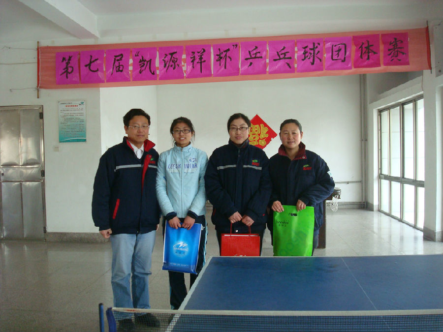 為了增加節(jié)日氣氛,豐富職工業(yè)余生活,公司于2011年1月2日組織了第七屆“凱源祥杯”乒乓球賽。本次比賽共有20余名選手報名參加。雖然大家平時沒有經(jīng)過專門的訓(xùn)練,但是比賽也異常激烈。本次比賽分:團體賽和個人賽。制劑銷售實習(xí)人員也參加了此次比賽,在本次比賽中表現(xiàn)突出,打出了自己的風(fēng)格。比賽激發(fā)了大家的拼搏熱情與集體榮譽感,并以積極向上的態(tài)度投入到工作中去。